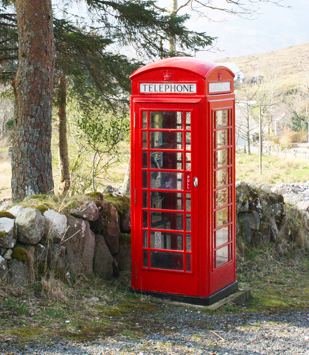 Along the side of an empty country road in Skye, this brightly colored red telephone booth stands at the ready to assist the wander along her way.