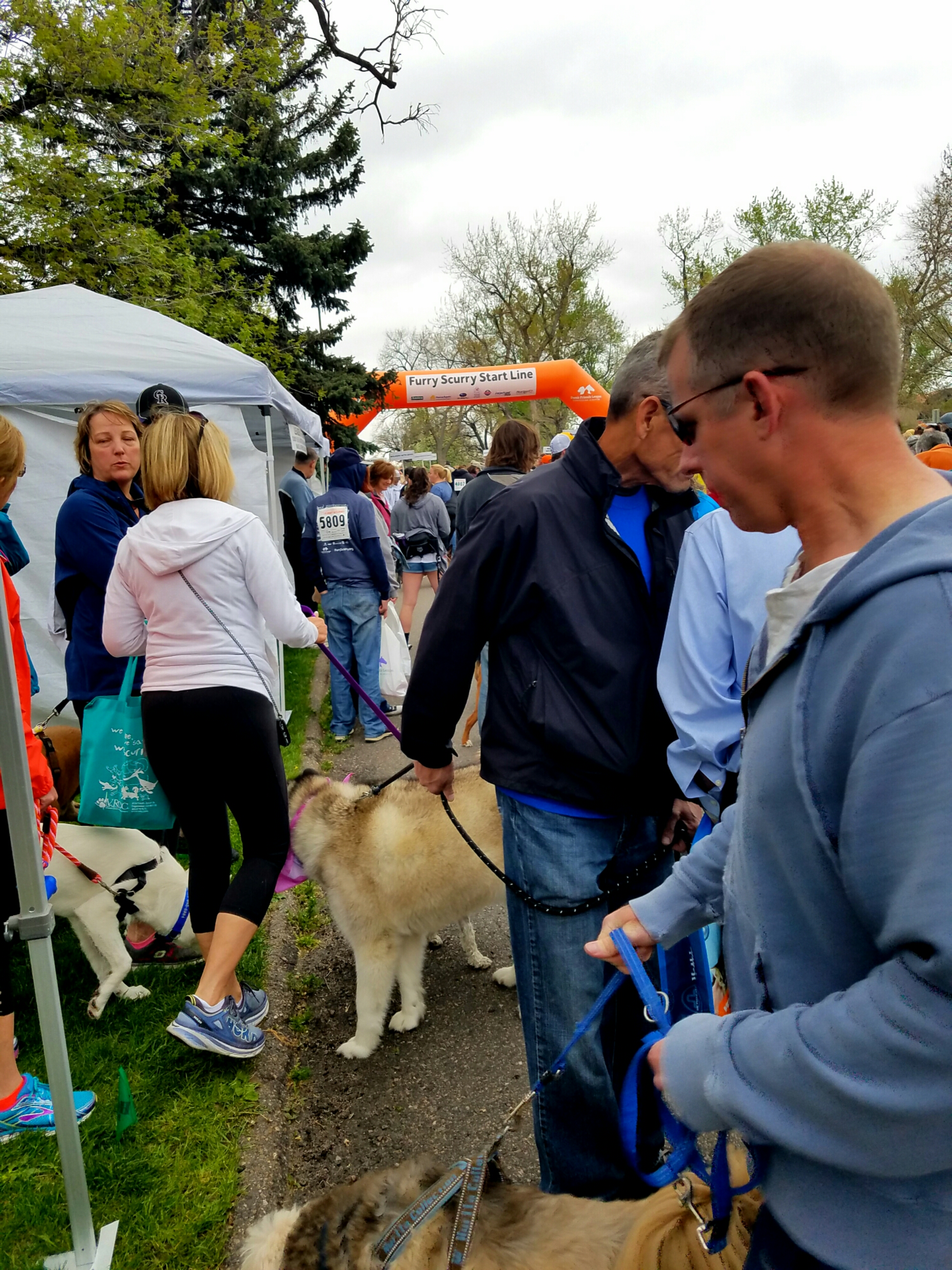 Once a year chaos rules the Furry Scurry in Denver.  10,000 dogs and 20,000 humans gather to walk or run a 3K race to benefit the Dumb Friends League. This was its 23rd year.  Oberon and I took part, this was his  debut to the crowd of different dogs and my 3rd race.  He loved meeting all the dogs.