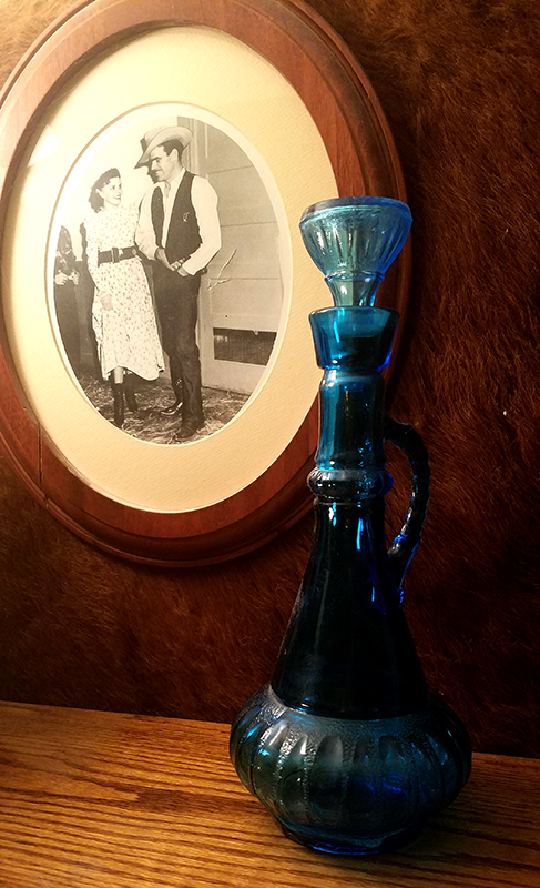I don’t have much from my parent’s but this genie bottle. It was a popular bottle back during the “I dream of Jeannie” tv days and this photo of my Mother and Father that was taken when I was 3 months old. They had gone to a dance that night. Oh, by the way, Dad drank all the alcohol that was in the bottle. 🙂