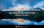 The traveler sees what he sees, the tourist sees what he has come to see. -Gilbert K. Chesterton Read more